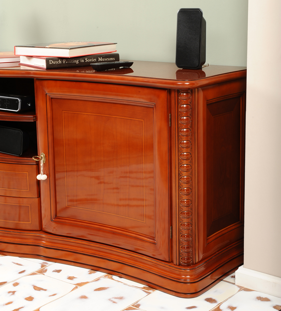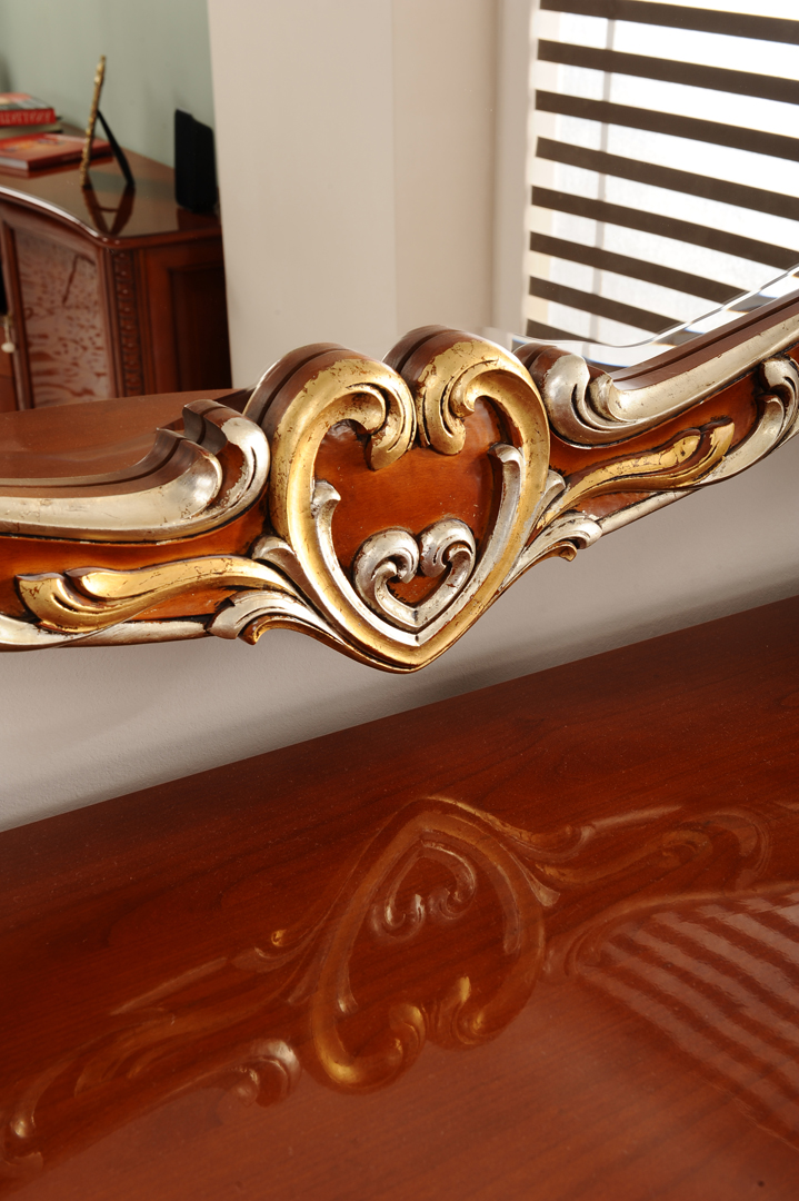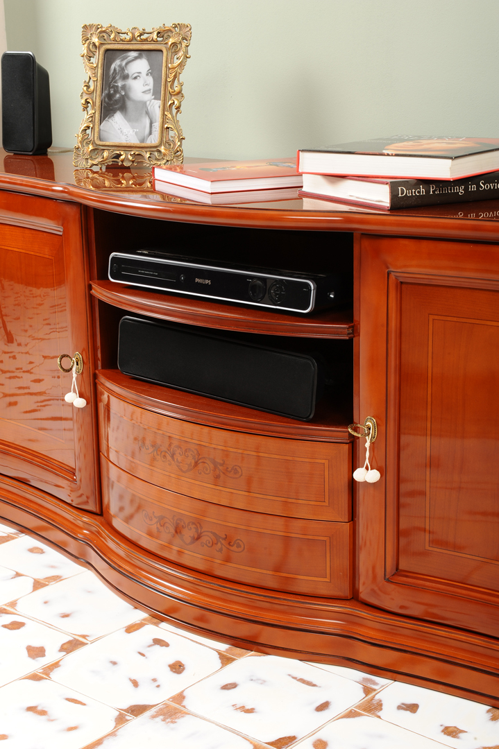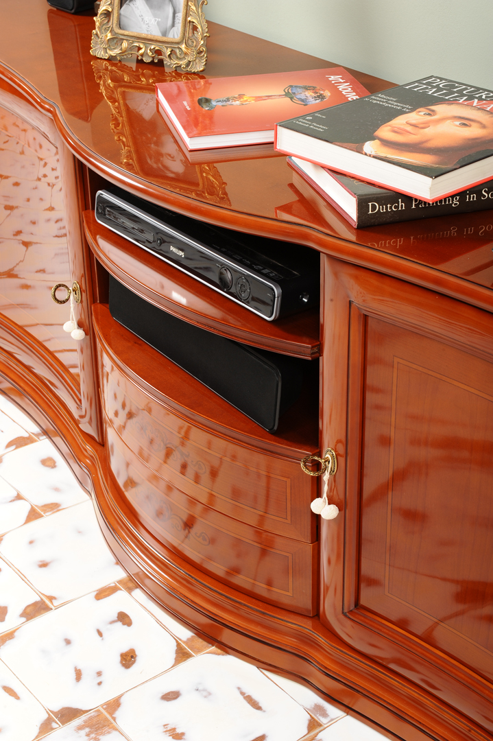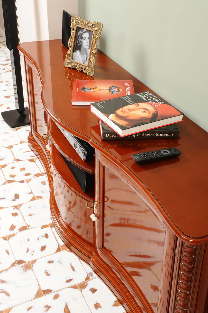 Finisajele atent lucrate, fronturile decorate discret si manerele elegante completeaza aspectul rafinat al piesei. Servanta poate fi personalizata ca dimensiuni si finisaj, fiind realizata exclusiv la comanda.